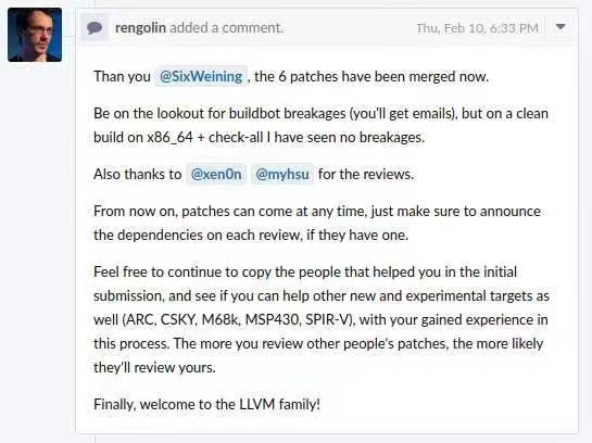 In the future, Loongson will keep on actively interacting with developers in the LLVM compiler community with a positive attitude and embrace valuable suggestions from professional developers to further improve the LoongArch ISA ecosystem and promote the establishment of the LoongArch branch in the upstream community so that the international community can support China’s LoongArch instruction system in addition to X86, ARM, and other instruction systems.
