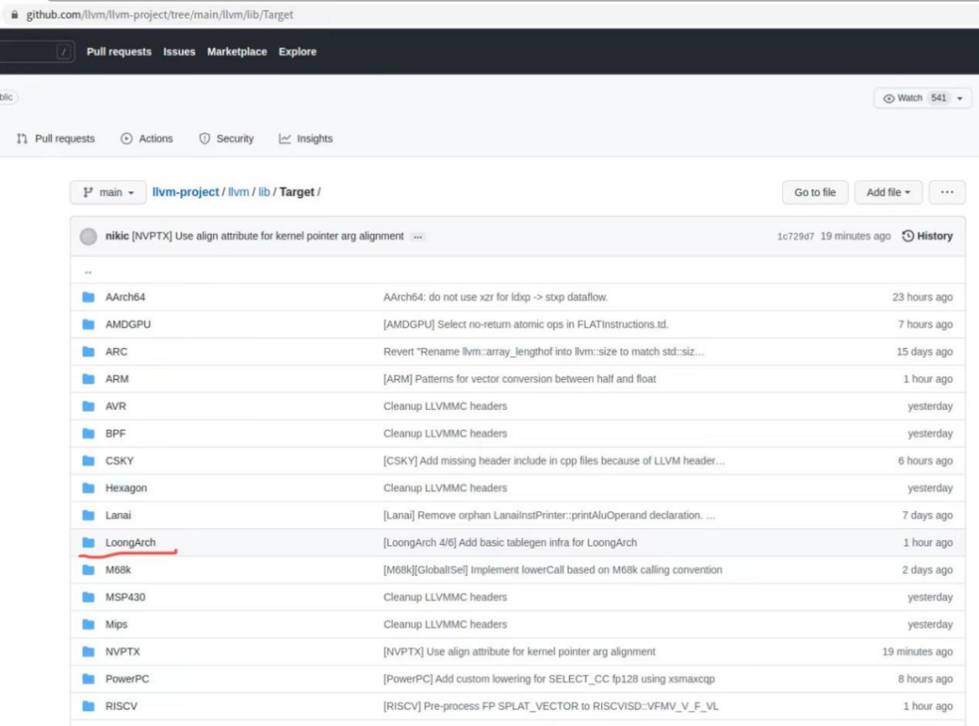 Recently, the initial patches of LoongArch ISA (Loongson's self-developed CPU instruction set architecture) have officially been accepted into the LLVM compiler community, and the LoongArch top-level directory has been listed in the main source code library. The LoongArch has now become an ISA comparable to X86, ARM, and other ISAs in the LLVM compiler community.
