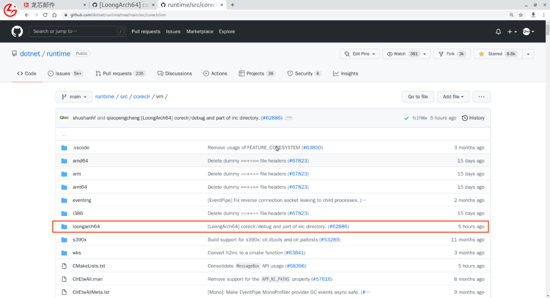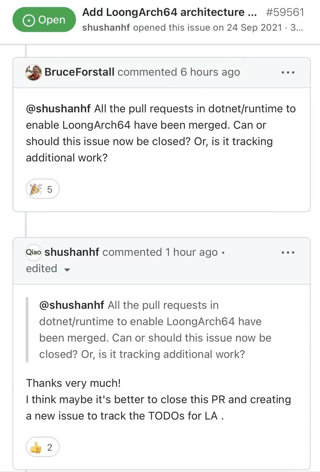 In September 2021, Loongson Technology submitted a LoongArch support plan to the .NET community, initiating the work of obtaining native support for LoongArch from the .NET community. In December 2021, Loongson submitted the complete source code of LoongArch to the community. Since then, the company has maintained close communication with the community and conducted detailed reviews, in-depth discussions, and multiple rounds of revisions and iterations on the source code of LoongArch64 with their developers. In April 2022, all foundational runtime architecture code passed the community's technical review and was integrated into the main development branch, making LoongArch a brand-new CPU architecture natively supported by the .NET community.