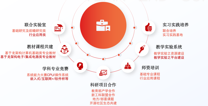 龍芯將從(cong) 聯合實驗室、教材/課程共建、學科專(zhuan) 業(ye) 競賽、科研項目合作、師資培訓、教學實驗係統、實習(xi) 實踐就業(ye) 等多個(ge) 領域切入,打造龍芯高等教育產(chan) 學合作框架,形成高校信息化人才培養(yang) 解決(jue) 方案,毫無保留地分享龍芯信創人才培養(yang) 經驗和智慧。