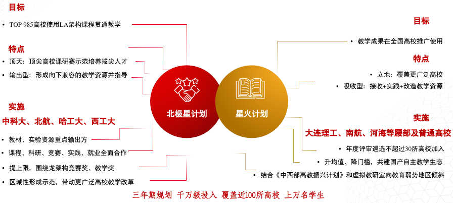 2024年新利体育18官方网站匯集資金、軟硬件平台等千萬(wan) 級資源投入建設3年期“星火”計劃,該計劃旨在聯合更廣泛高校共建基於(yu) LoongArch國產(chan) 自主指令係統之教學生態,同時進行三個(ge) 維度的擴展,一是課程維度從(cong) 專(zhuan) 業(ye) 基礎核心課程向專(zhuan) 業(ye) 應用課程擴展;二是資源維度從(cong) 教材實驗向慕課、教學管理、開源社區等全方位資源擴展;三是適用性維度從(cong) 拔尖人才培養(yang) 向全層次及教育弱勢地區擴展,全麵提升高校計算機係統能力教學質量與(yu) 學生應對複雜係統的綜合設計開發能力。首批“星火”計劃合作高校將在2024年內(nei) 完成評審簽約。