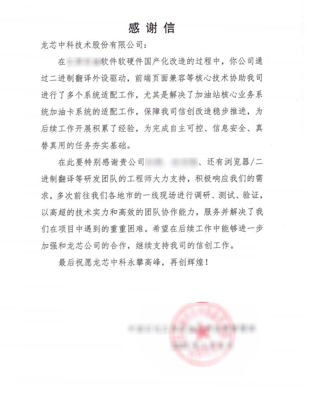 “星光不負趕路人,江河眷顧奮楫者。”此次項目不僅(jin) 彰顯了強大的龍芯實力,也為(wei) 石化行業(ye) 打造出可供借鑒的國產(chan) 化轉型標杆案例。經過運行,係統表現良好,企業(ye) 在感謝信中表示:“龍芯通過二進製翻譯外設驅動、前端頁麵兼容等核心技術協助我司進行了多個(ge) 係統適配工作,尤其是解決(jue) 了加油站核心業(ye) 務係統加油卡係統的適配工作,保障我司信創改造穩步推進,為(wei) 後續工作開展積累了經驗,為(wei) 完成自主可控、信息安全、真替真用的任務夯實基礎”。