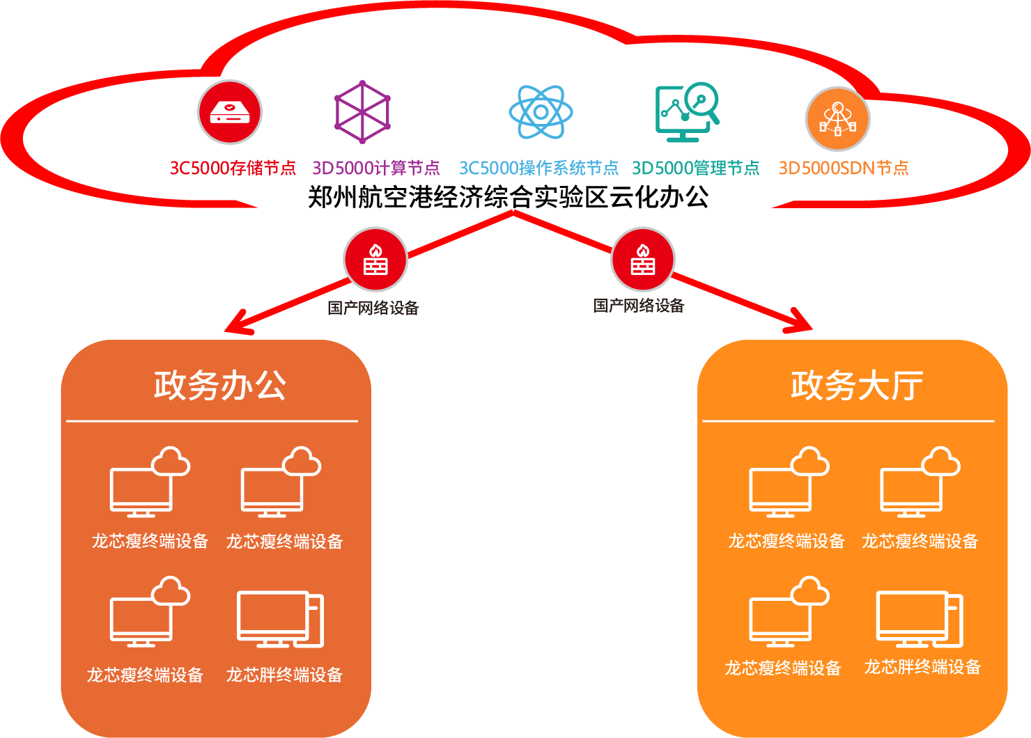項目充分發揮龍芯3C5000、3D5000等處理器的卓越性能優(you) 勢,成功構建了集存儲(chu) 、計算、操作係統、管理和軟件定義(yi) 網絡(SDN)等關(guan) 鍵節點於(yu) 一體(ti) 的雲(yun) 端資源池,完成從(cong) 前端、網絡設備到後端的全鏈條國產(chan) 化替代。這一高效、穩定的雲(yun) 平台,以龍芯服務器為(wei) 支撐,部署龍芯雲(yun) 桌麵瘦終端和胖終端,將支撐鄭州航空港日常辦公和信息化建設,為(wei) 政務辦公、政務大廳等多樣化場景提供優(you) 質服務。
